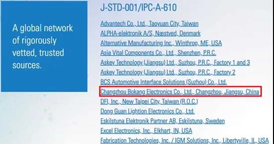 2021年1月5日,位于常州市的電子制造服務商常州博康電子技術有限公司經(jīng)過近半年的工藝制程優(yōu)化,依照IPC J-STD-001《焊接的電氣與電子組件要求》與IPC-A-610《電子組件的可接受性》對工藝制程和產(chǎn)品的要求,順利通過IPC QML認證,而榮列IPC全球可信資源庫。